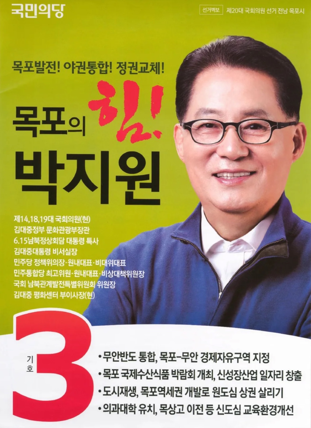 | 2016 | 제20대 국회의원 선거 | 전남 목포 | 국민의당 | 56.38% | 당선 (4선) |